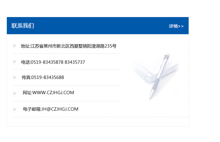 地址:常州市新北區友邦商務大廈1幢16、17層  電話:0519-85101652  傳真:0519-85112595  郵編:213022  網址:www.cz-jiayue_cn.huang-jiawang.com  郵箱:xiajifengaa@163.com